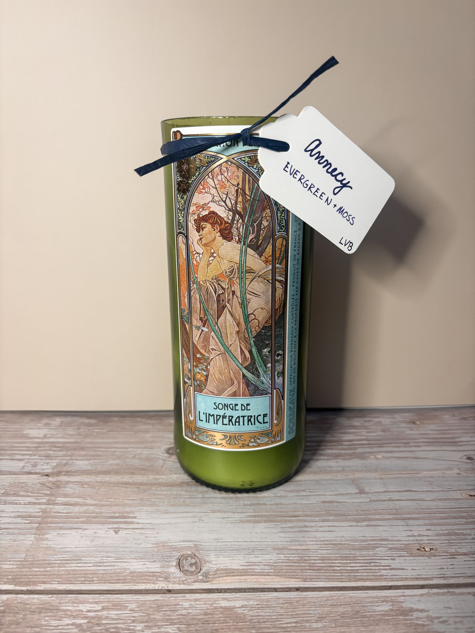 Cool, serene, and naturally elegant, Annecy reflects the tranquil beauty of its alpine lakeside setting — where clear waters meet forested hills and quiet paths wind beneath towering pines. Hand-poured into an upcycled Songe de l’Impératrice Sauvignon Blanc bottle, it blends the crisp depth of evergreen with the earthy softness of moss for a fragrance that feels refreshing, grounding, and effortlessly soothing. A gentle tribute to misty mornings, emerald landscapes, and the peaceful charm that defines Annecy.